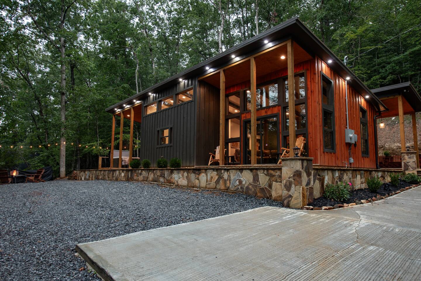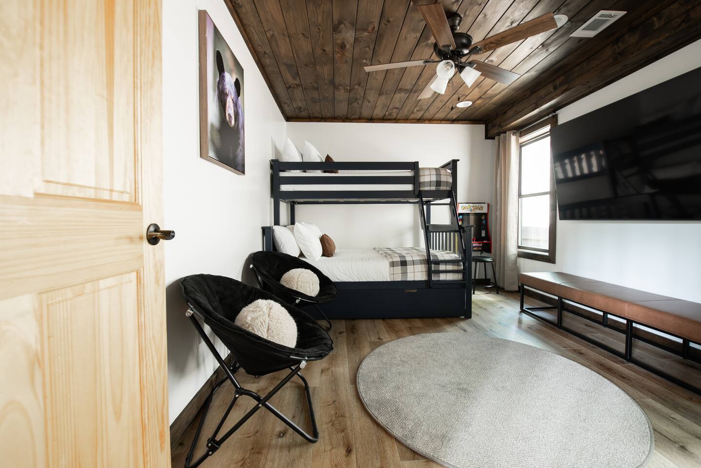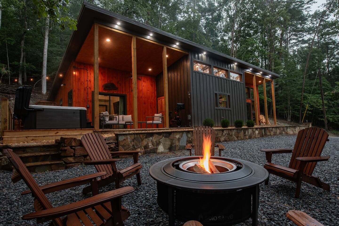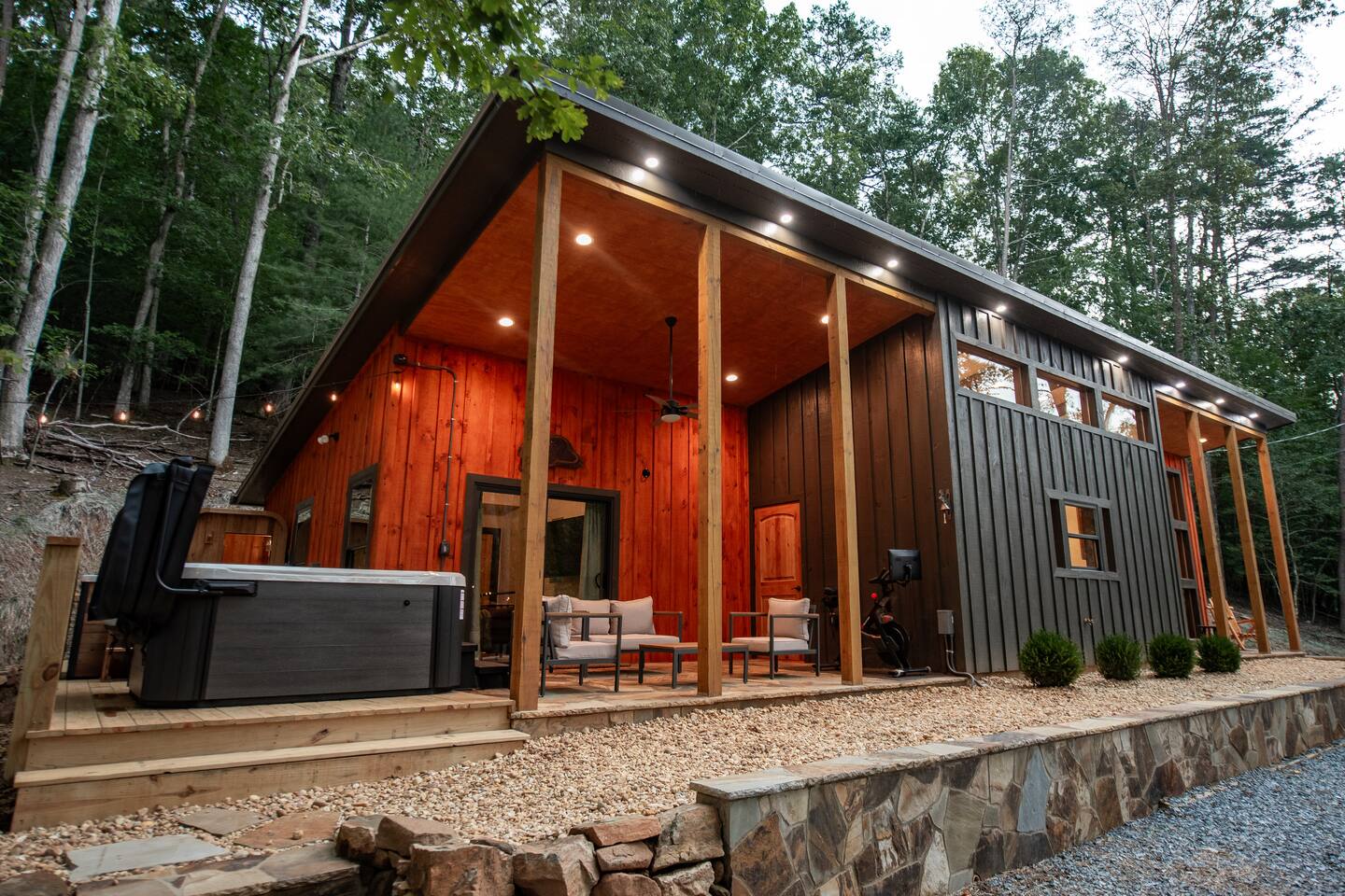 Welcome to Elevate - Perfect for the whole family or a couples retreat A brand new lux cabin with: - Sauna - Cold plunge (Closed for winter) - Hot tub - EV Charging Outlet - Peloton, TRX, Theragun, compression boots, yoga - Fire Pit Hear the river from front patio Games: - Pac-Man - Cornhole - Giant Jenga - Poker - Board games Sleep in comfort w: - 2 king beds (adjustable base, Serta mattresses, Quince bamboo sheets) - Full/Tw/Tw bunk room Smart TVs in every room + fully stocked kitchen