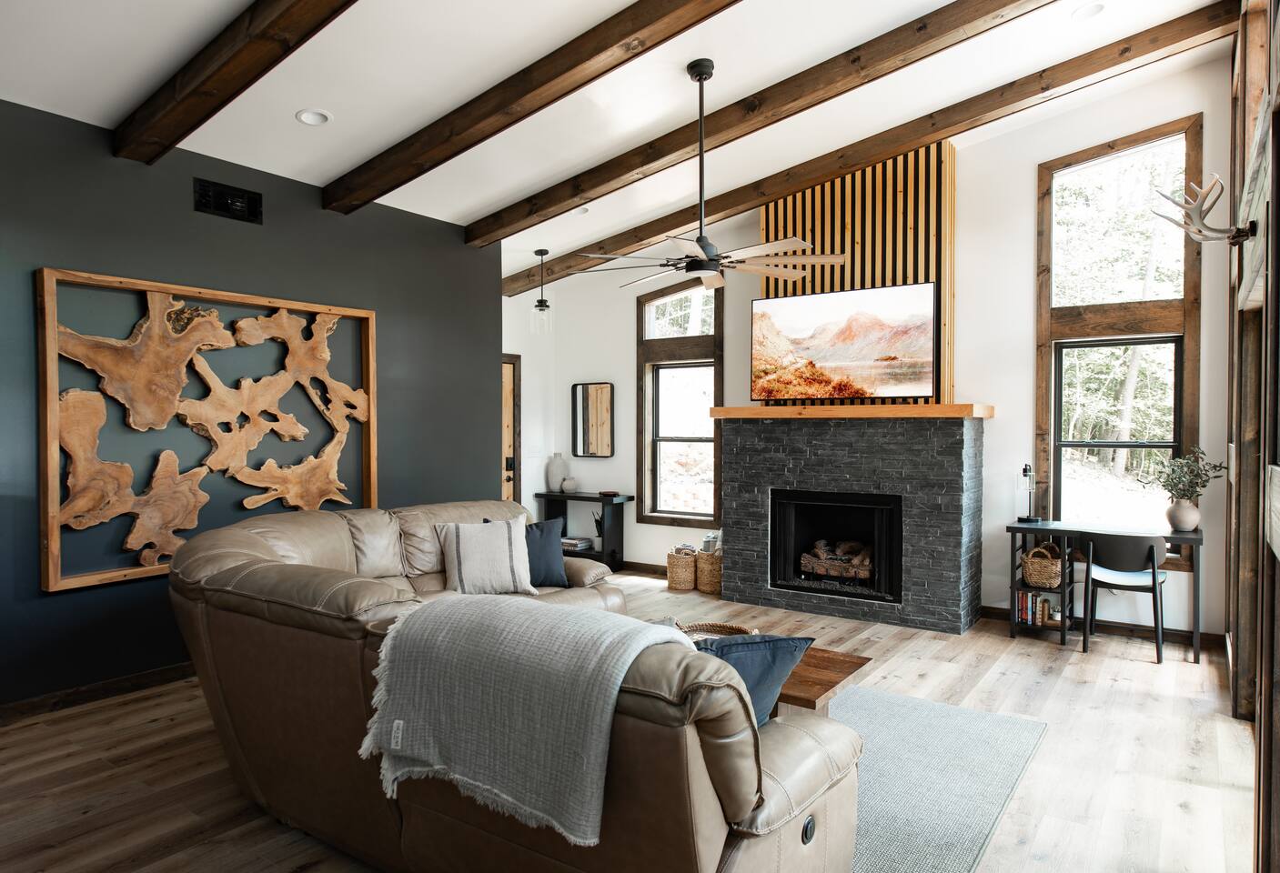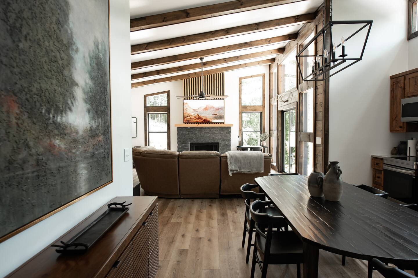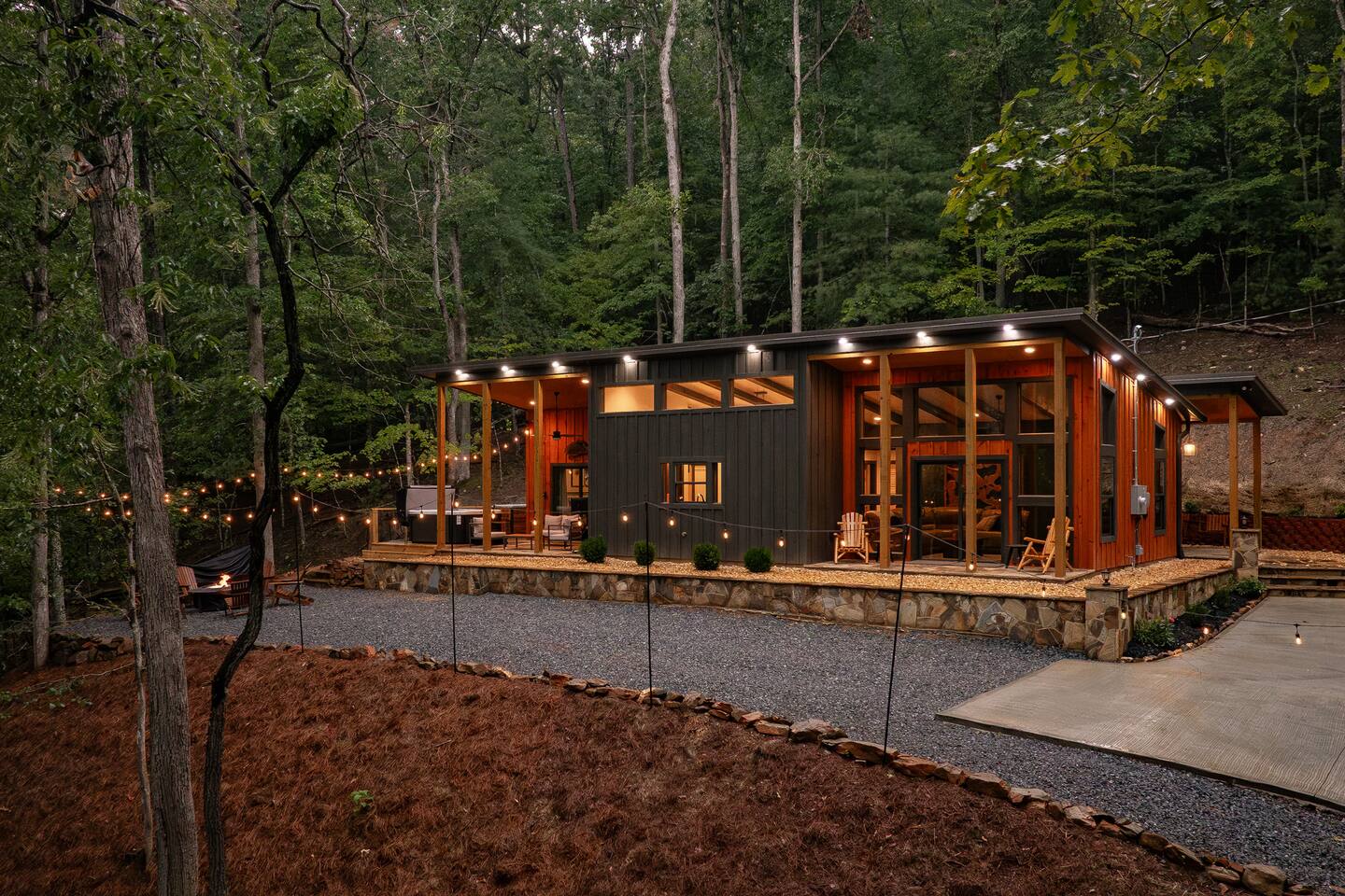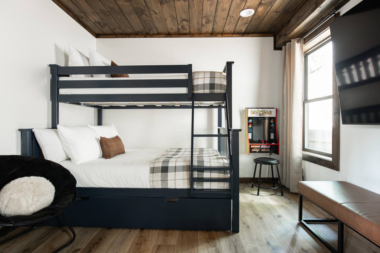 Welcome to Elevate - Perfect for the whole family or a couples retreat A brand new lux cabin with: - Sauna - Cold plunge (Closed for winter) - Hot tub - EV Charging Outlet - Peloton, TRX, Theragun, compression boots, yoga - Fire Pit Hear the river from front patio Games: - Pac-Man - Cornhole - Giant Jenga - Poker - Board games Sleep in comfort w: - 2 king beds (adjustable base, Serta mattresses, Quince bamboo sheets) - Full/Tw/Tw bunk room Smart TVs in every room + fully stocked kitchen
