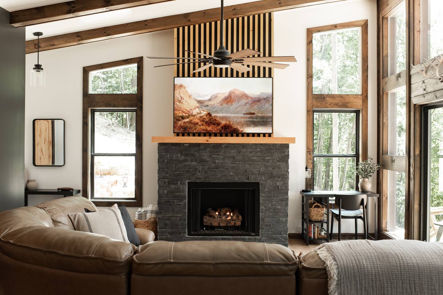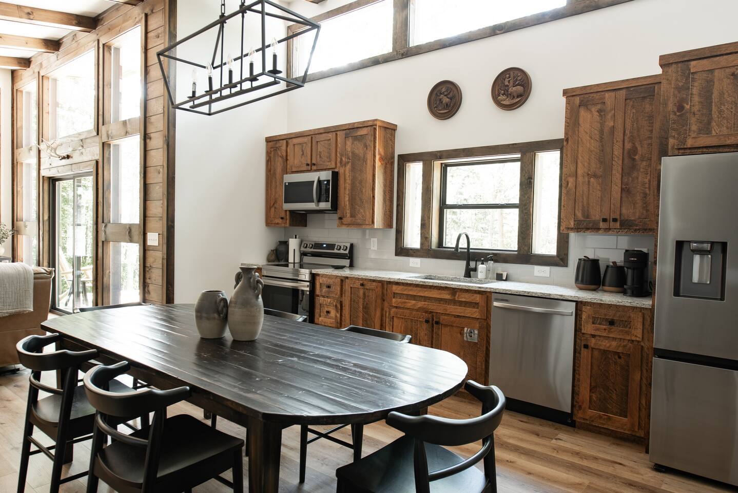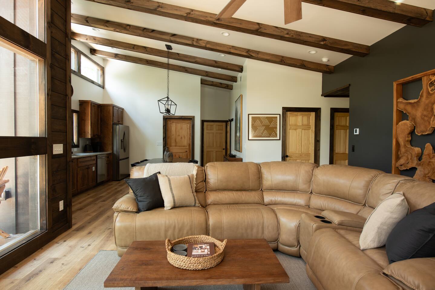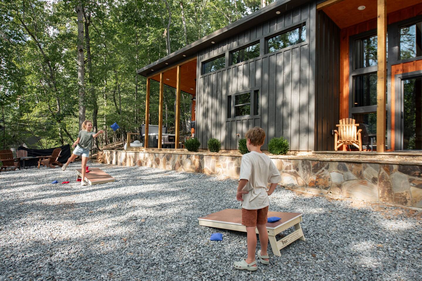 Welcome to Elevate - Perfect for the whole family or a couples retreat A brand new lux cabin with: - Sauna - Cold plunge (Closed for winter) - Hot tub - EV Charging Outlet - Peloton, TRX, Theragun, compression boots, yoga - Fire Pit Hear the river from front patio Games: - Pac-Man - Cornhole - Giant Jenga - Poker - Board games Sleep in comfort w: - 2 king beds (adjustable base, Serta mattresses, Quince bamboo sheets) - Full/Tw/Tw bunk room Smart TVs in every room + fully stocked kitchen