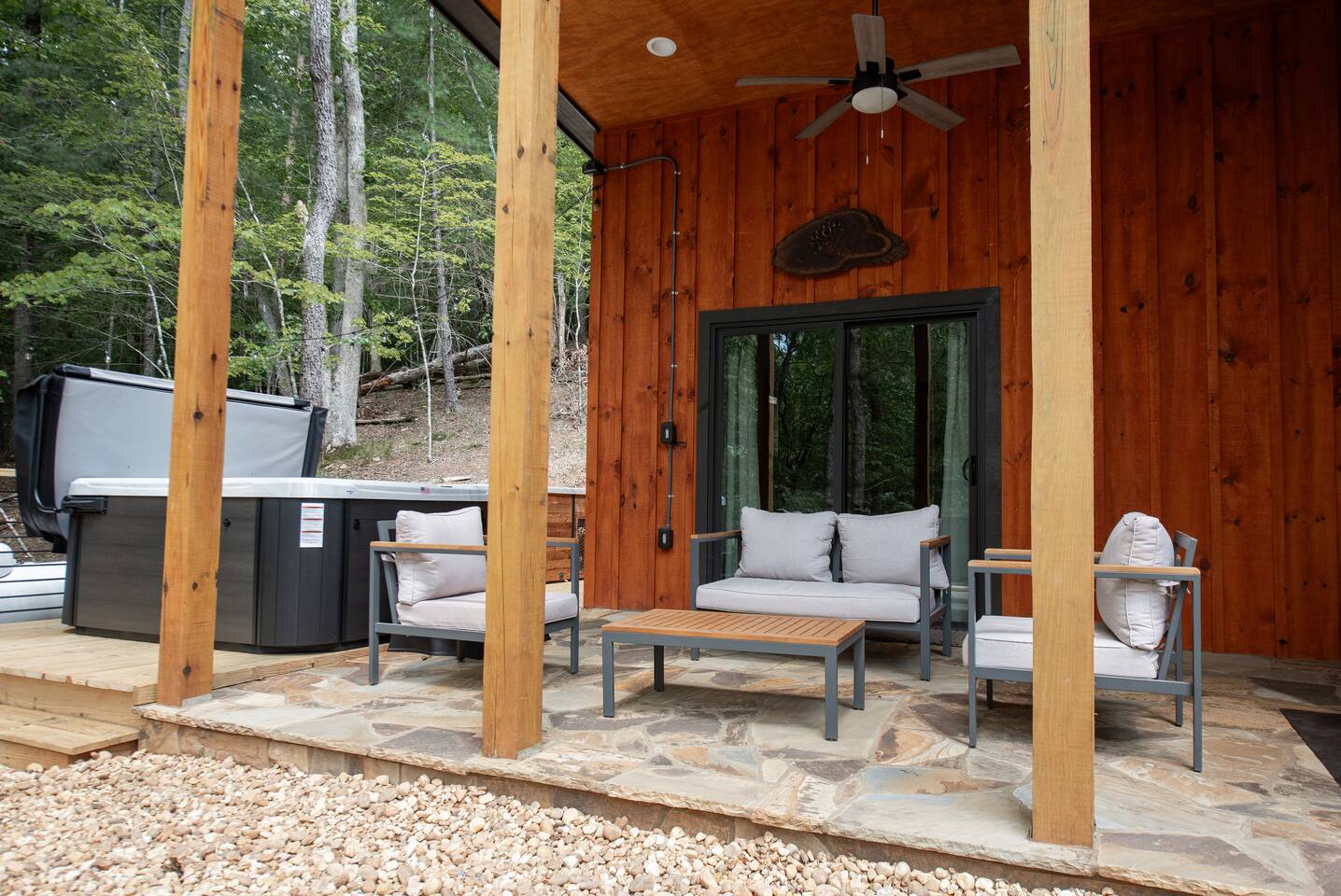 Peaceful cabin tucked in the forest. Hear the rushing river from the front patio. EV Charging Outlet (Level 2) - 15-20 minute drive to Ellijay Square - 10-15 minute drive to multiple wineries (Grapes & Ladders, Engelheim, etc) Located in Coosawattee River Resort with complimentary access to amenities such as: - Tennis - Pickleball - Swimming pool - Mini golf - Fishing ponds & river access. Single story home with: - 3 bedrooms - 2 bathrooms - 2 private covered patios Bedroom 1: - King bed - Private bathroom - Private closet Bedroom 2: - King bed - Shared bathroom in hallway (not connected) - Private closet Bedroom 3: - Bunk bed with full bed, twin top bunk, and twin trundle. - Shared bathroom in hallway (not connected) - Private closet Deck: Hot Tub, Sauna, Cold Plunge 2 Private covered patios with comfortable seating and tables. Full living room, dining room, kitchen, & dedicated workspace. Large firepit area and room for outdoor games, such as cornhole and giant Jenga (provided).